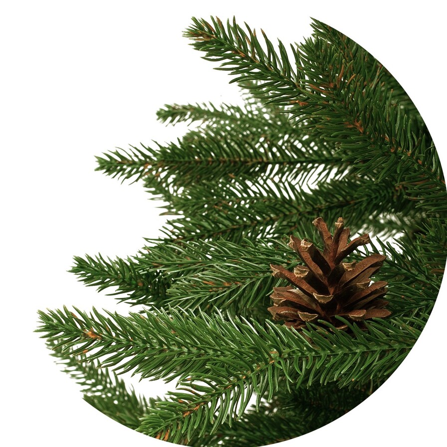 Za sprawą dużej ilości koron oraz gałązek, drzewko jest naturalnie gęste. Chcąc oddać piękno leśnego świerka, choinka została przyozdobiona naturalnymi szyszkami. Cieniowanie kolorów na gałązkach sprawia, że wyglądają, jakby były w fazie wzrostu.