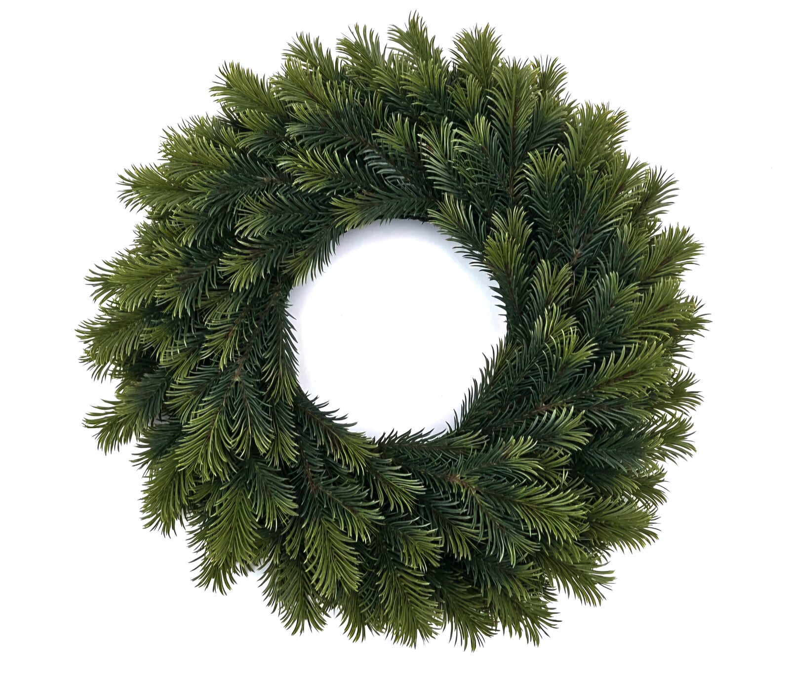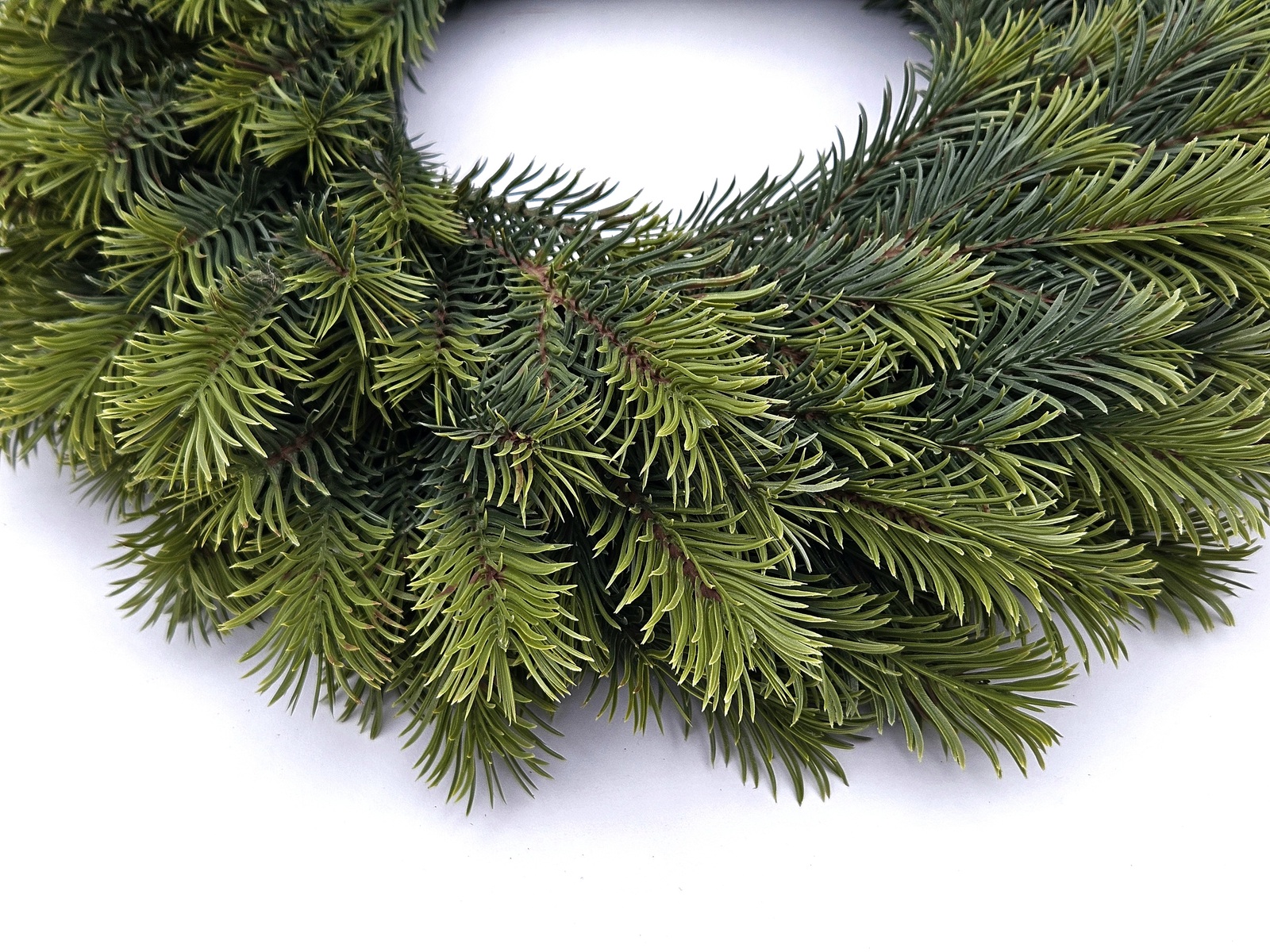 • Gęste, miękkie igły o naturalnym odcieniu zieleni – gałązki są pełne, sprężyste i przyjemne w dotyku. Subtelne przejścia kolorów nadają im głębi i autentyczności, tworząc harmonijną, elegancką kompozycję, która do złudzenia przypomina świeży wianek z prawdziwego igliwia.