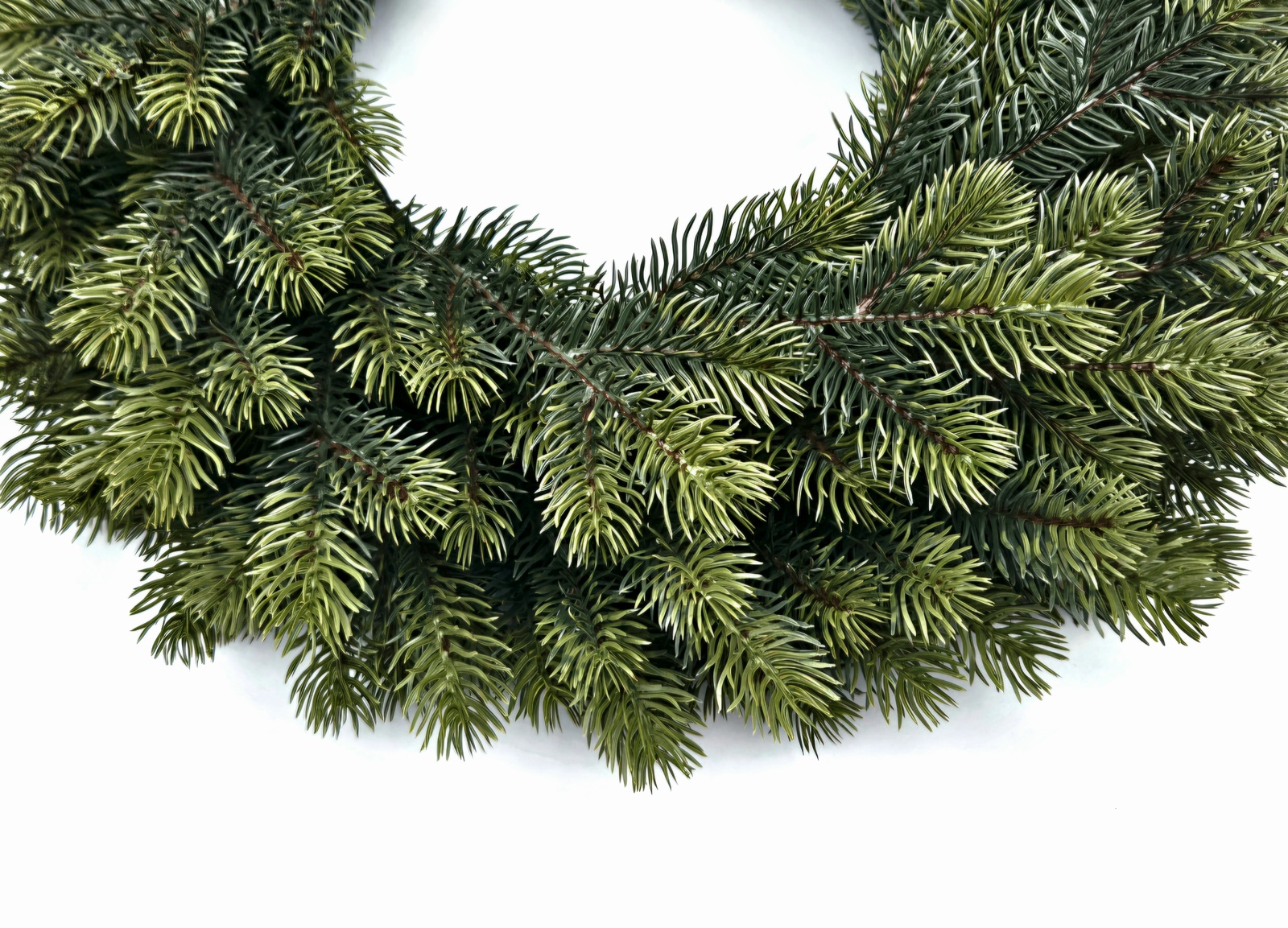 • Gęste, miękkie igły o naturalnym odcieniu zieleni – gałązki są pełne, sprężyste i przyjemne w dotyku. Subtelne przejścia kolorów nadają im głębi i autentyczności, tworząc harmonijną, elegancką kompozycję, która do złudzenia przypomina świeży wianek z prawdziwego igliwia.